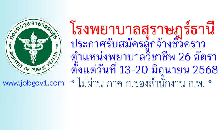 โรงพยาบาลสุราษฎร์ธานี รับสมัครลูกจ้างชั่วคราว ตำแหน่งพยาบาลวิชาชีพ 26 อัตรา ตั้งแต่วันที่ 13-20 มิถุนายน 2568