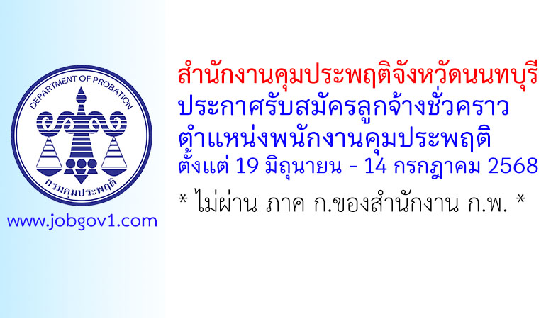 สำนักงานคุมประพฤติจังหวัดนนทบุรี รับสมัครลูกจ้างชั่วคราว ตำแหน่งพนักงานคุมประพฤติ ตั้งแต่ 19 มิถุนายน – 14 กรกฎาคม 2568