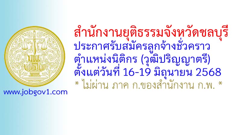 สำนักงานยุติธรรมจังหวัดชลบุรี รับสมัครลูกจ้างชั่วคราว ตำแหน่งนิติกร (วุฒิปริญญาตรี) ตั้งแต่วันที่ 16-19 มิถุนายน 2568