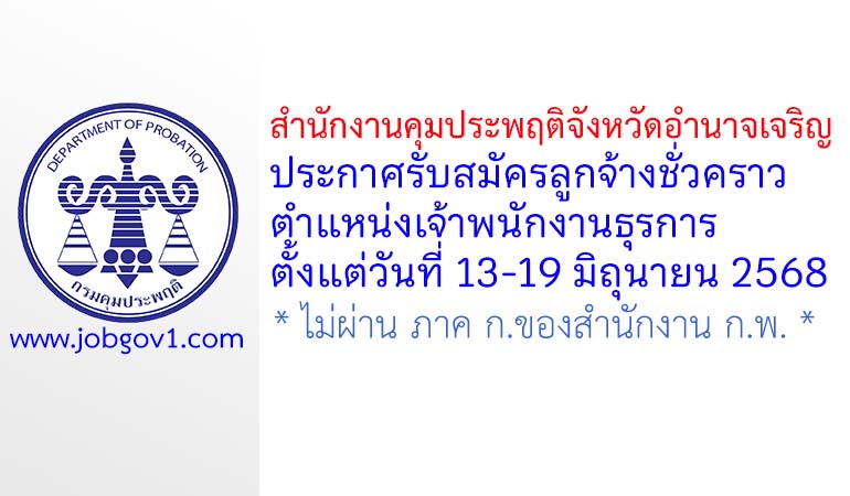 สำนักงานคุมประพฤติจังหวัดอำนาจเจริญ รับสมัครลูกจ้างชั่วคราว ตำแหน่งเจ้าพนักงานธุรการ ตั้งแต่วันที่ 13-19 มิถุนายน 2568