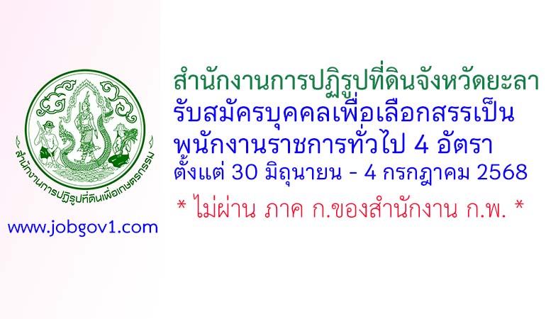 สำนักงานการปฏิรูปที่ดินจังหวัดยะลา รับสมัครบุคคลเพื่อเลือกสรรเป็นพนักงานราชการทั่วไป 3 อัตรา ตั้งแต่ 30 มิถุนายน – 4 กรกฎาคม 2568