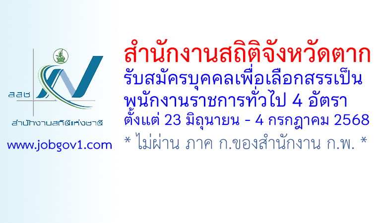 สำนักงานสถิติจังหวัดตาก รับสมัครบุคคลเพื่อเลือกสรรเป็นพนักงานราชการทั่วไป 4 อัตรา ตั้งแต่ 23 มิถุนายน – 4 กรกฎาคม 2568