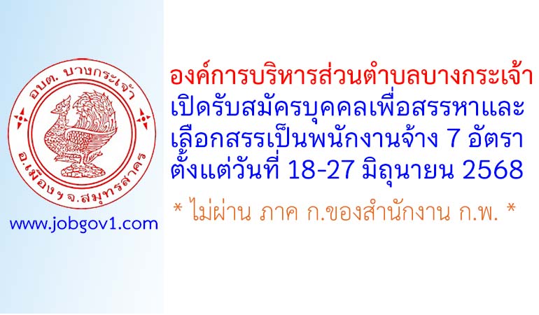 องค์การบริหารส่วนตำบลบางกระเจ้า รับสมัครบุคคลเพื่อสรรหาและเลือกสรรเป็นพนักงานจ้าง 7 อัตรา ตั้งแต่วันที่ 18-27 มิถุนายน 2568