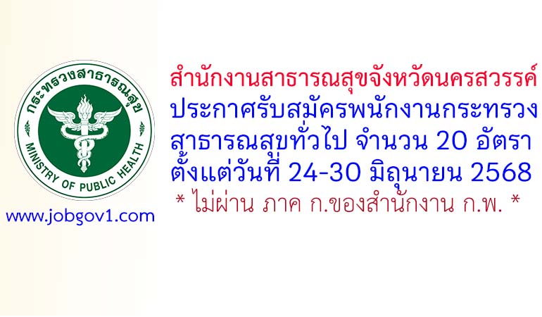 สำนักงานสาธารณสุขจังหวัดนครสวรรค์ รับสมัครพนักงานกระทรวงสาธารณสุขทั่วไป 20 อัตรา ตั้งแต่วันที่ 24-30 มิถุนายน 2568
