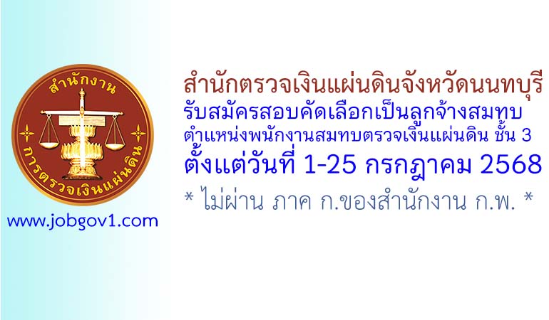 สำนักตรวจเงินแผ่นดินจังหวัดนนทบุรี รับสมัครสอบคัดเลือกเป็นลูกจ้างสมทบ ตำแหน่งพนักงานสมทบตรวจเงินแผ่นดิน ชั้น 3 ตั้งแต่วันที่ 1-25 กรกฎาคม 2568