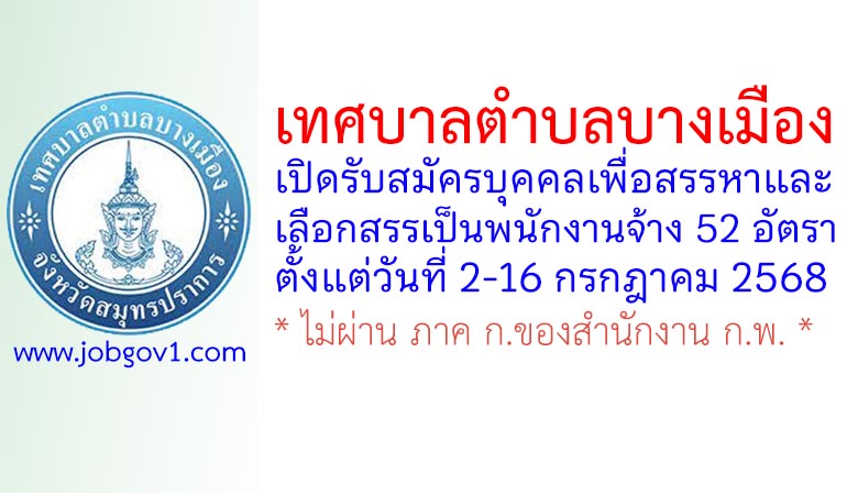 เทศบาลตำบลบางเมือง รับสมัครบุคคลเพื่อสรรหาและเลือกสรรเป็นพนักงานจ้าง 52 อัตรา ตั้งแต่วันที่ 2-16 กรกฎาคม 2568