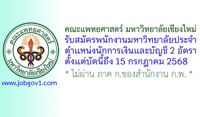 คณะแพทยศาสตร์ มหาวิทยาลัยเชียงใหม่ รับสมัครพนักงานมหาวิทยาลัยประจำ ตำแหน่งนักการเงินและบัญชี 2 อัตรา ตั้งแต่บัดนี้ถึง 15 กรกฎาคม 2568