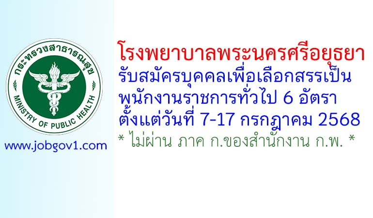 โรงพยาบาลพระนครศรีอยุธยา รับสมัครบุคคลเพื่อเลือกสรรเป็นพนักงานราชการทั่วไป 6 อัตรา ตั้งแต่วันที่ 7-17 กรกฎาคม 2568