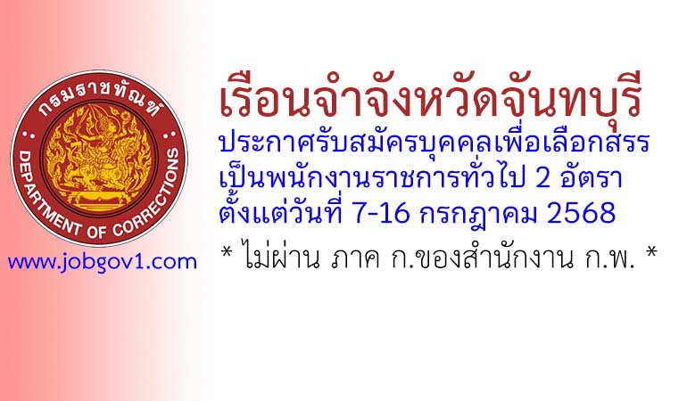เรือนจำจังหวัดจันทบุรี รับสมัครบุคคลเพื่อเลือกสรรเป็นพนักงานราชการทั่วไป 2 อัตรา ตั้งแต่วันที่ 7-16 กรกฎาคม 2568