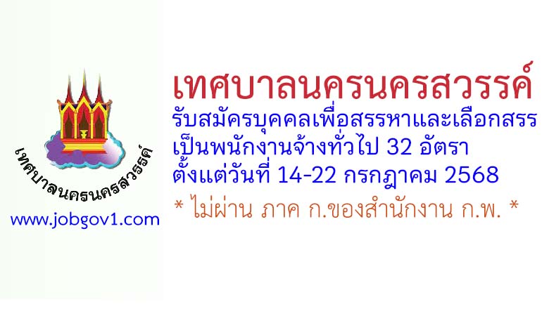 เทศบาลนครนครสวรรค์ รับสมัครบุคคลเพื่อสรรหาและเลือกสรรเป็นพนักงานจ้างทั่วไป 32 อัตรา ตั้งแต่วันที่ 14-22 กรกฎาคม 2568