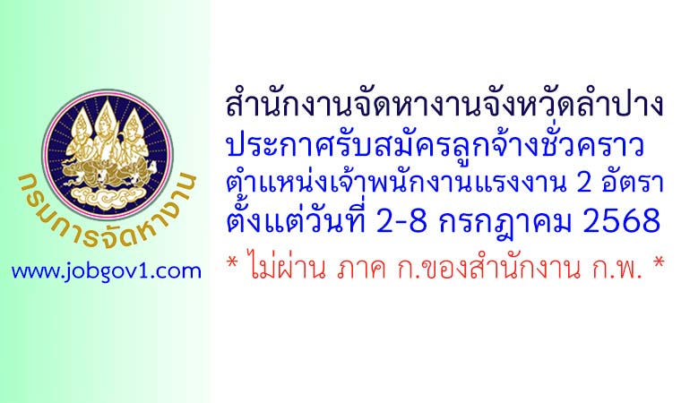สำนักงานจัดหางานจังหวัดลำปาง รับสมัครลูกจ้างชั่วคราว ตำแหน่งเจ้าพนักงานแรงงาน 2 อัตรา ตั้งแต่วันที่ 2-8 กรกฎาคม 2568