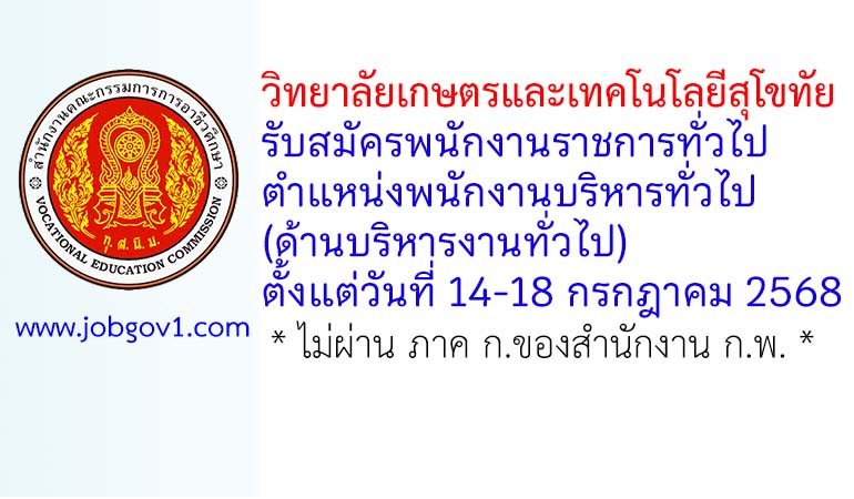 วิทยาลัยเกษตรและเทคโนโลยีสุโขทัย รับสมัครพนักงานราชการทั่วไป ตำแหน่งพนักงานบริหารทั่วไป (ด้านบริหารงานทั่วไป) ตั้งแต่วันที่ 14-18 กรกฎาคม 2568