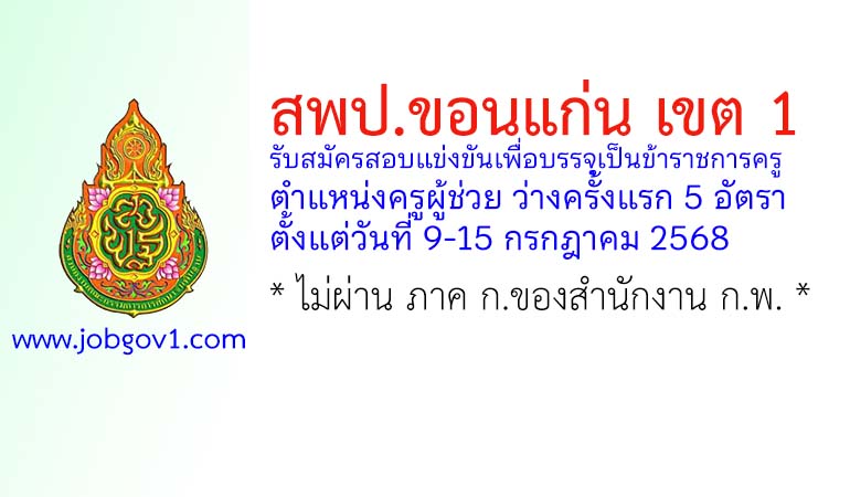 ประกาศ อ.ก.ค.ศ.เขตพื้นที่การศึกษาประถมศึกษาขอนแก่น เขต 1 เรื่อง รับสมัครสอบแข่งขันเพื่อบรรจุและแต่งตั้งบุคคลเข้ารับราชการเป็นข้าราชการครูและบุคลากรทางการศึกษา ตำแหน่งครูผู้ช่วย สังกัดสำนักงานคณะกรรมการการศึกษาขั้นพื้นฐาน ปี พ.ศ. 2568