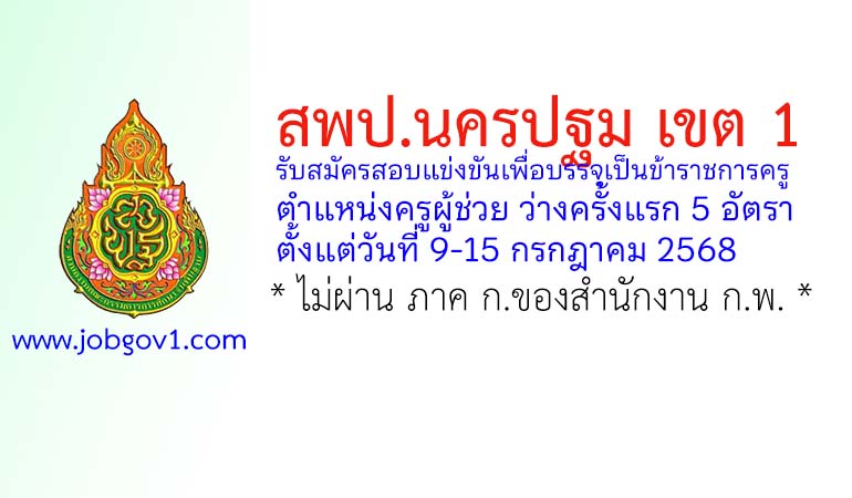 สพป.นครปฐม เขต 1 รับสมัครสอบแข่งขันเพื่อบรรจุเป็นข้าราชการครู ตำแหน่งครูผู้ช่วย ว่างครั้งแรก 5 อัตรา ตั้งแต่วันที่ 9-15 กรกฎาคม 2568