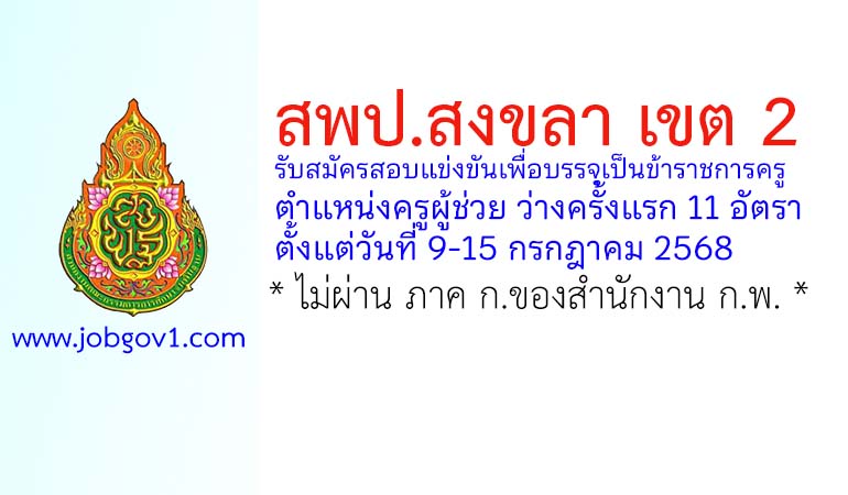 สพป.สงขลา เขต 2 รับสมัครสอบแข่งขันเพื่อบรรจุเป็นข้าราชการครู ตำแหน่งครูผู้ช่วย ว่างครั้งแรก 11 อัตรา ตั้งแต่วันที่ 9-15 กรกฎาคม 2568