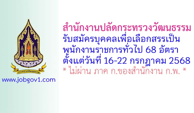 สำนักงานปลัดกระทรวงวัฒนธรรม รับสมัครบุคคลเพื่อเลือกสรรเป็นพนักงานราชการทั่วไป 68 อัตรา ตั้งแต่วันที่ 16-22 กรกฎาคม 2568