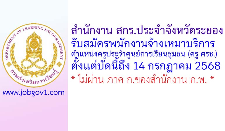 ประกาศสำนักงานส่งเสริมการเรียนรู้ประจำจังหวัดระยอง เรื่อง เรื่อง รับสมัครคัดเลือกบุคคลเพื่อจ้างเหมาบริการเป็นพนักงานจ้างปฏิบัติงาน ตำแหน่ง ครูประจำศูนย์การเรียนชุมชน (ครู ศรช.)