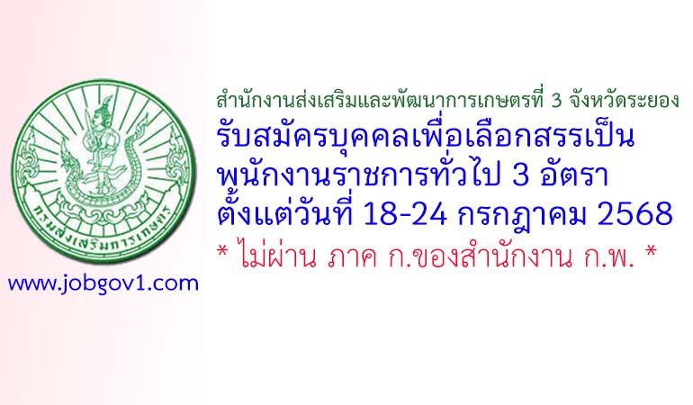 สำนักงานส่งเสริมและพัฒนาการเกษตรที่ 3 จังหวัดระยอง รับสมัครบุคคลเพื่อเลือกสรรเป็นพนักงานราชการทั่วไป 3 อัตรา ตั้งแต่วันที่ 18-24 กรกฎาคม 2568