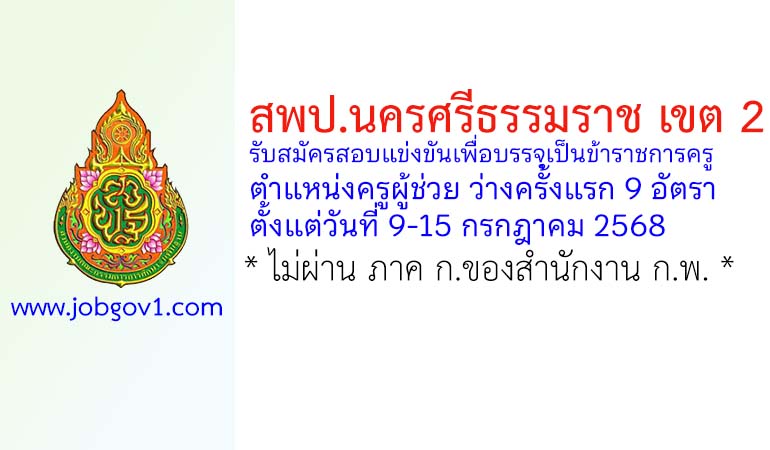 ประกาศ อ.ก.ค.ศ. เขตพื้นที่การศึกษาประถมศึกษานครศรีธรรมราช เขต 2 เรื่อง รับสมัครสอบแข่งขันเพื่อบรรจุและแต่งตั้งบุคคลเข้ารับราชการเป็นข้าราชการครูและบุคลากรทางการศึกษา ตำแหน่งครูผู้ช่วย สังกัดสำนักงานคณะกรรมการการศึกษาขั้นพื้นฐาน ปี พ.ศ. 2568