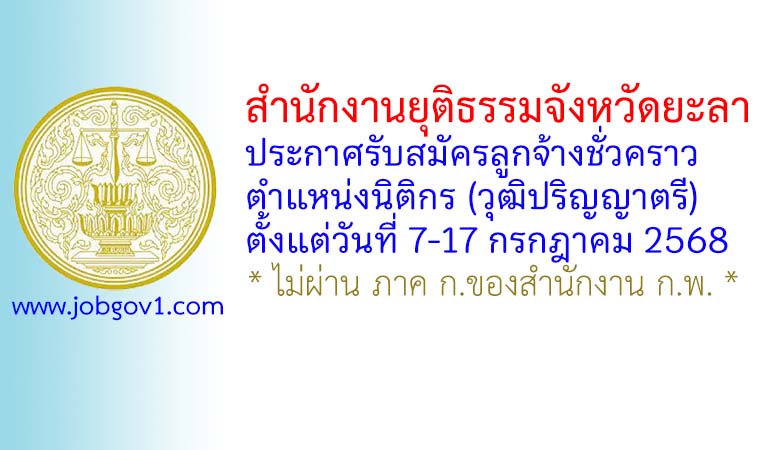 สำนักงานยุติธรรมจังหวัดยะลา รับสมัครลูกจ้างชั่วคราว ตำแหน่งนิติกร (วุฒิปริญญาตรี) ตั้งแต่วันที่ 7-17 กรกฎาคม 2568