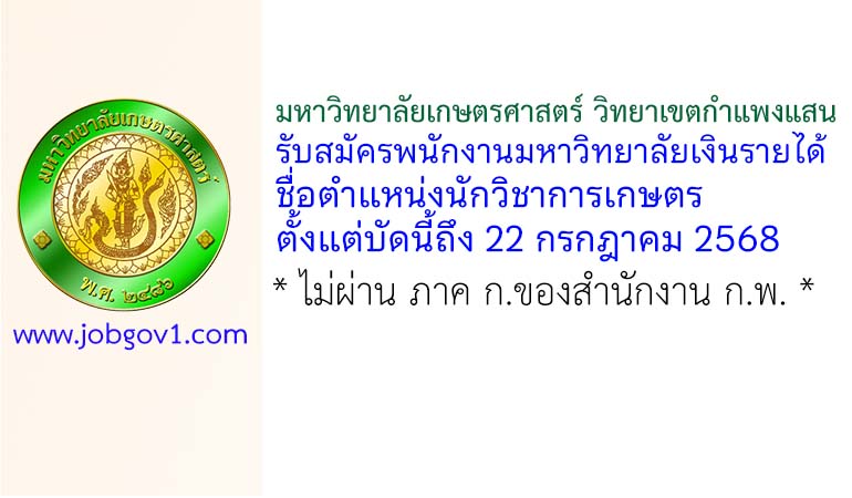 มหาวิทยาลัยเกษตรศาสตร์ วิทยาเขตกำแพงแสน รับสมัครพนักงานมหาวิทยาลัยเงินรายได้ ตำแหน่งนักวิชาการเกษตร ตั้งแต่บัดนี้ถึง 22 กรกฎาคม 2568