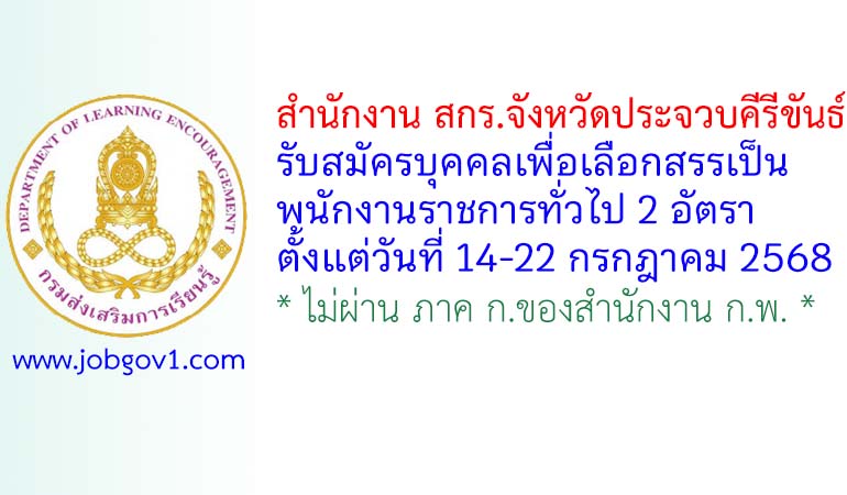 ประกาศสำนักงานส่งเสริมการเรียนรู้ประจำจังหวัดประจวบคีรีขันธ์ เรื่อง รับสมัครบุคคลเพื่อสรรหาและเลือกสรรเป็นพนักงานราชการทั่วไป สังกัดสำนักงานส่งเสริมการเรียนรู้ประจำจังหวัดประจวบคีรีขันธ์