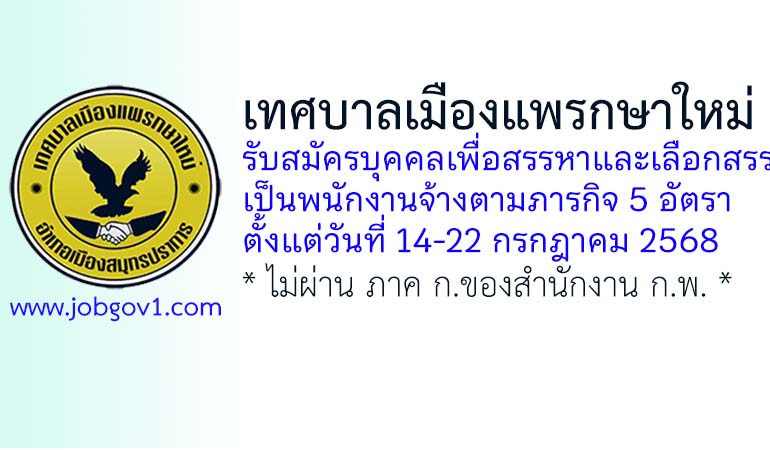 เทศบาลเมืองแพรกษาใหม่ รับสมัครบุคคลเพื่อสรรหาและเลือกสรรเป็นพนักงานจ้างตามภารกิจ 5 อัตรา ตั้งแต่วันที่ 14-22 กรกฎาคม 2568