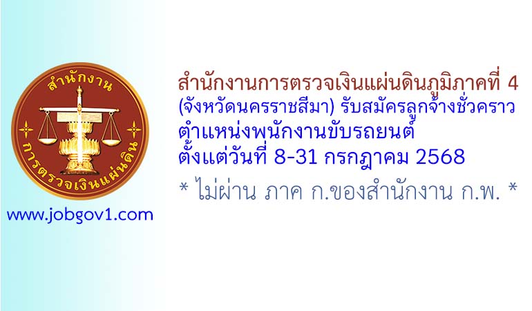 สำนักงานการตรวจเงินแผ่นดินภูมิภาคที่ 4 (จังหวัดนครราชสีมา) รับสมัครลูกจ้างชั่วคราว ตำแหน่งพนักงานขับรถยนต์ ตั้งแต่วันที่ 8-31 กรกฎาคม 2568