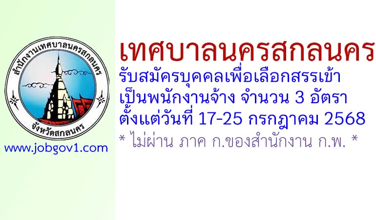 เทศบาลนครสกลนคร รับสมัครบุคคลเพื่อเลือกสรรเข้าเป็นพนักงานจ้าง 3 อัตรา ตั้งแต่วันที่ 17-25 กรกฎาคม 2568