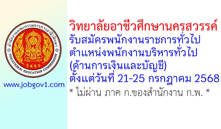 วิทยาลัยอาชีวศึกษานครสวรรค์ รับสมัครพนักงานราชการทั่วไป ตำแหน่งพนักงานบริหารทั่วไป (ด้านการเงินและบัญชี) ตั้งแต่วันที่ 21-25 กรกฎาคม 2568