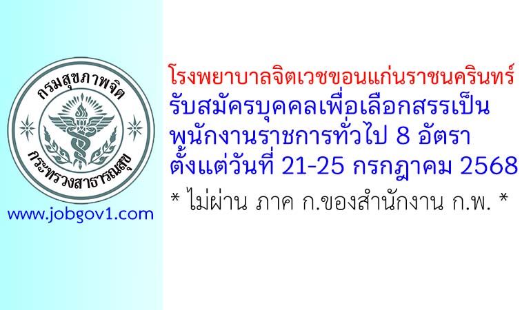 โรงพยาบาลจิตเวชขอนแก่นราชนครินทร์ รับสมัครบุคคลเพื่อเลือกสรรเป็นพนักงานราชการทั่วไป 8 อัตรา ตั้งแต่วันที่ 21-25 กรกฎาคม 2568