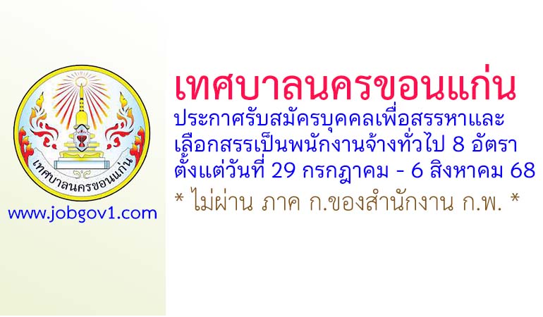 เทศบาลนครขอนแก่น รับสมัครบุคคลเพื่อสรรหาและเลือกสรรเป็นพนักงานจ้างทั่วไป 8 อัตรา ตั้งแต่วันที่ 29 กรกฎาคม – 6 สิงหาคม 2568