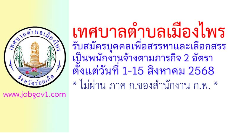 เทศบาลตำบลเมืองไพร รับสมัครบุคคลเพื่อสรรหาและเลือกสรรเป็นพนักงานจ้างตามภารกิจ 2 อัตรา ตั้งแต่วันที่ 1-15 สิงหาคม 2568