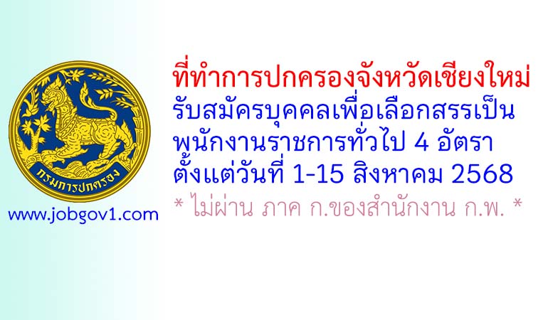 ที่ทำการปกครองจังหวัดเชียงใหม่ รับสมัครบุคคลเพื่อเลือกสรรเป็นพนักงานราชการทั่วไป 4 อัตรา ตั้งแต่วันที่ 1-15 สิงหาคม 2568