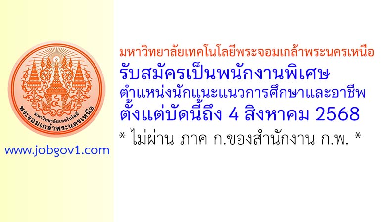 มหาวิทยาลัยเทคโนโลยีพระจอมเกล้าพระนครเหนือ รับสมัครเป็นพนักงานพิเศษ ตำแหน่งนักแนะแนวการศึกษาและอาชีพ ตั้งแต่บัดนี้ถึง 4 สิงหาคม 2568