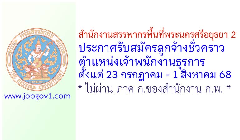 สำนักงานสรรพากรพื้นที่พระนครศรีอยุธยา 2 รับสมัครลูกจ้างชั่วคราว ตำแหน่งเจ้าพนักงานธุรการ ตั้งแต่ 23 กรกฎาคม – 1 สิงหาคม 2568