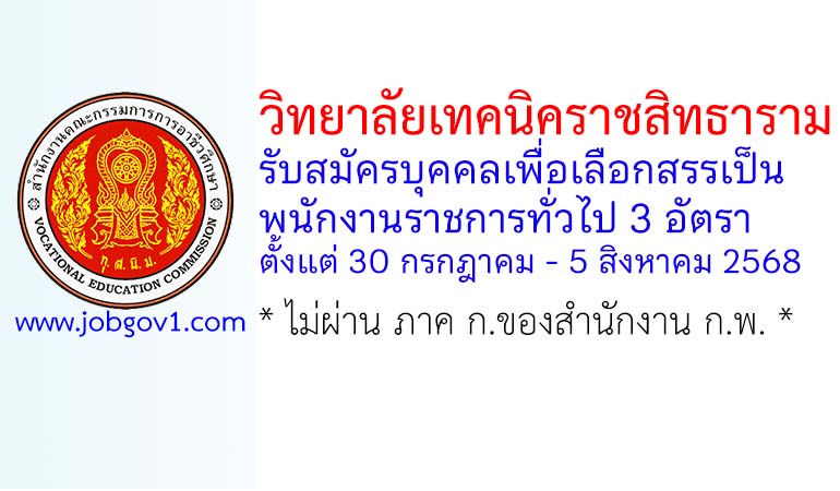 วิทยาลัยเทคนิคราชสิทธาราม รับสมัครบุคคลเพื่อเลือกสรรเป็นพนักงานราชการทั่วไป 3 อัตรา ตั้งแต่ 30 กรกฎาคม – 5 สิงหาคม 2568