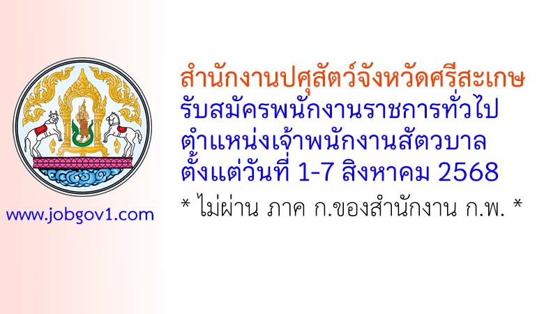 สำนักงานปศุสัตว์จังหวัดศรีสะเกษ รับสมัครพนักงานราชการทั่วไป ตำแหน่งเจ้าพนักงานสัตวบาล ตั้งแต่วันที่ 1-7 สิงหาคม 2568