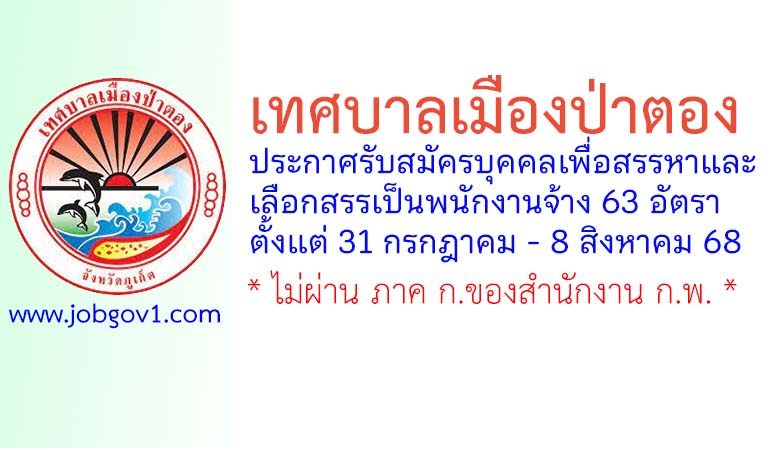 เทศบาลเมืองป่าตอง รับสมัครบุคคลเพื่อสรรหาและเลือกสรรเป็นพนักงานจ้าง 63 อัตรา ตั้งแต่ 31 กรกฎาคม – 8 สิงหาคม 2568