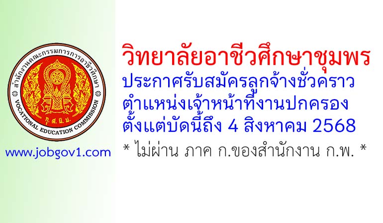 วิทยาลัยอาชีวศึกษาชุมพร รับสมัครลูกจ้างชั่วคราว ตำแหน่งเจ้าหน้าที่งานปกครอง ตั้งแต่บัดนี้ถึง 4 สิงหาคม 2568