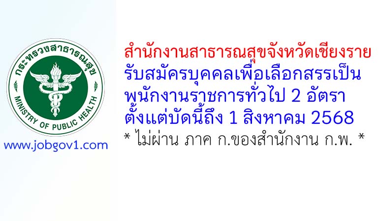 สำนักงานสาธารณสุขจังหวัดเชียงราย รับสมัครบุคคลเพื่อเลือกสรรเป็นพนักงานราชการทั่วไป 2 อัตรา ตั้งแต่บัดนี้ถึง 1 สิงหาคม 2568