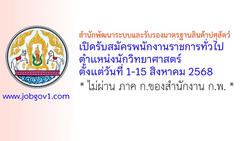 สำนักพัฒนาระบบและรับรองมาตรฐานสินค้าปศุสัตว์ รับสมัครพนักงานราชการทั่วไป ตำแหน่งนักวิทยาศาสตร์ ตั้งแต่วันที่ 1-15 สิงหาคม 2568