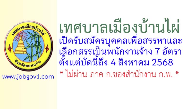 เทศบาลเมืองบ้านไผ่ รับสมัครบุคคลเพื่อสรรหาและเลือกสรรเป็นพนักงานจ้าง 7 อัตรา ตั้งแต่บัดนี้ถึง 4 สิงหาคม 2568