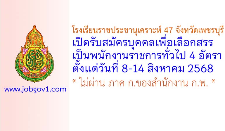 โรงเรียนราชประชานุเคราะห์ 47 จังหวัดเพชรบุรี รับสมัครบุคคลเพื่อเลือกสรรเป็นพนักงานราชการทั่วไป 4 อัตรา ตั้งแต่วันที่ 8-14 สิงหาคม 2568