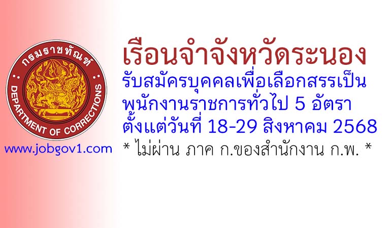 เรือนจำจังหวัดระนอง รับสมัครบุคคลเพื่อเลือกสรรเป็นพนักงานราชการทั่วไป 5 อัตรา ตั้งแต่วันที่ 18-29 สิงหาคม 2568