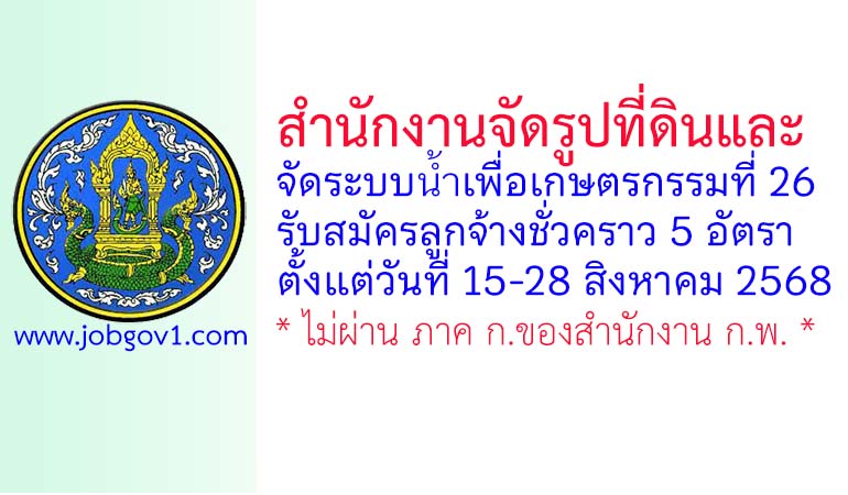 สำนักงานจัดรูปที่ดินและจัดระบบน้ำเพื่อเกษตรกรรมที่ 26 รับสมัครลูกจ้างชั่วคราว 5 อัตรา ตั้งแต่วันที่ 15-28 สิงหาคม 2568