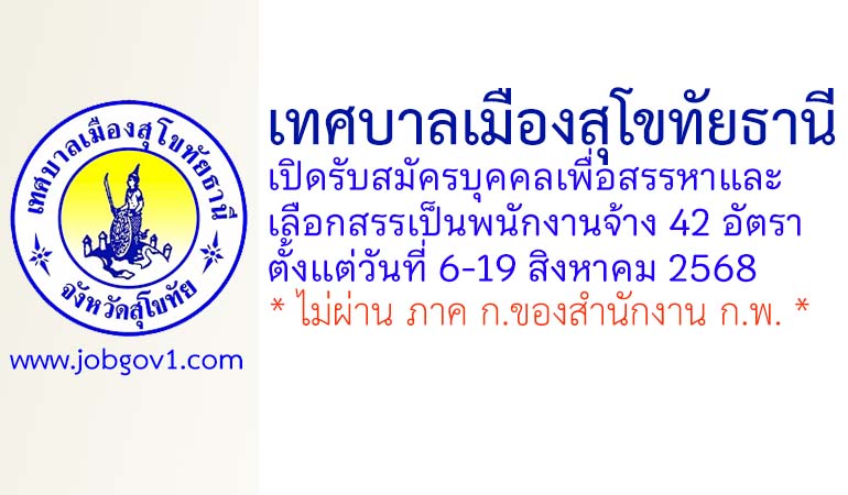 เทศบาลเมืองสุโขทัยธานี รับสมัครบุคคลเพื่อสรรหาและเลือกสรรเป็นพนักงานจ้าง 42 อัตรา ตั้งแต่วันที่ 6-19 สิงหาคม 2568