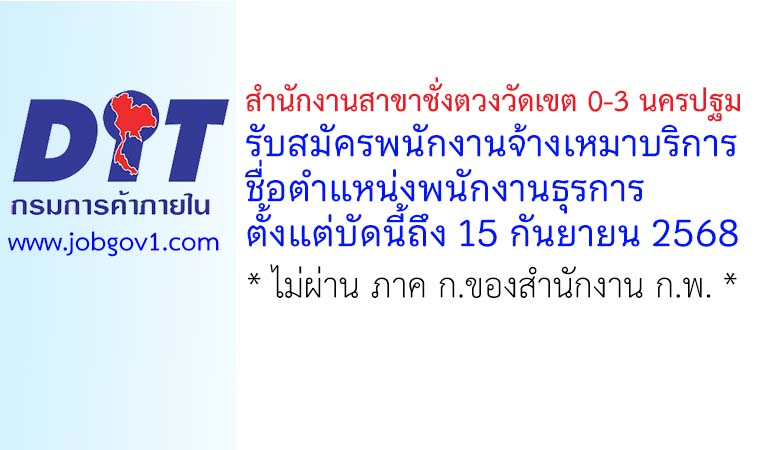 สำนักงานสาขาชั่งตวงวัดเขต 0-3 นครปฐม รับสมัครพนักงานจ้างเหมาบริการ ตำแหน่งพนักงานธุรการ ตั้งแต่บัดนี้ถึง 15 กันยายน 2568
