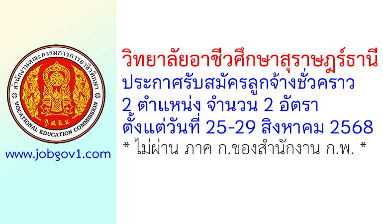 วิทยาลัยอาชีวศึกษาสุราษฎร์ธานี รับสมัครลูกจ้างชั่วคราว 2 อัตรา ตั้งแต่วันที่ 25-29 สิงหาคม 2568