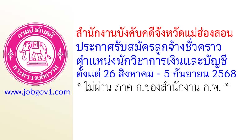 สำนักงานบังคับคดีจังหวัดแม่ฮ่องสอน รับสมัครลูกจ้างชั่วคราว ตำแหน่งนักวิชาการเงินและบัญชี ตั้งแต่ 26 สิงหาคม – 5 กันยายน 2568
